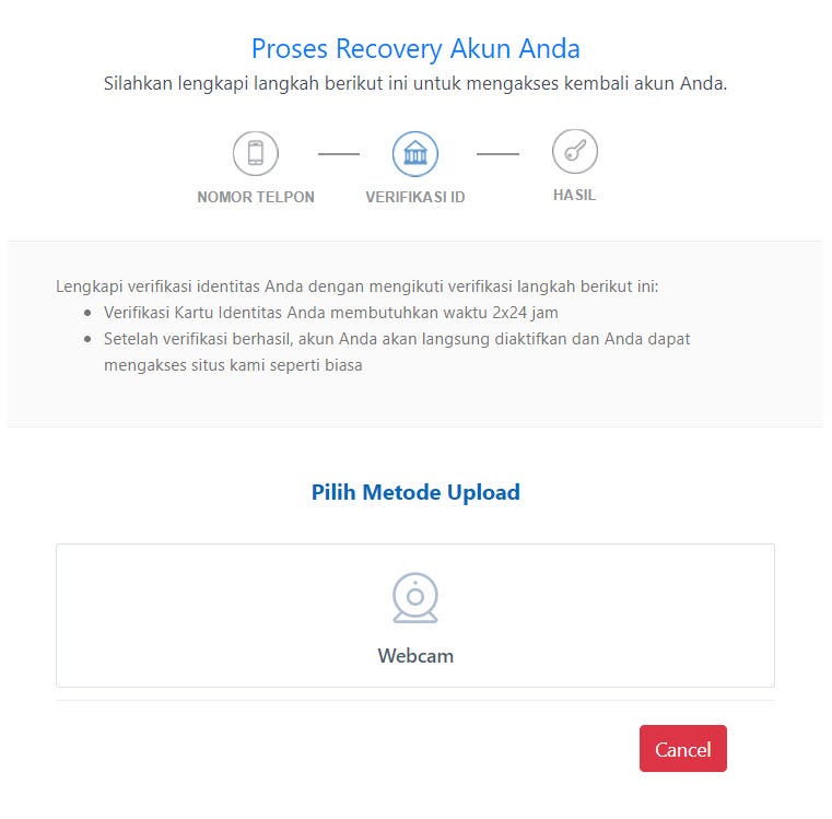 8. Klik tautan Webcam untuk mememilih metode upload untuk melengkapi verifikasi ID dengan photo selfie. Photo selfie dilengkapi dengan kertas bertuliskan Verifikasi kehilangan ID rekeningku.com dan tanda tangan anda.