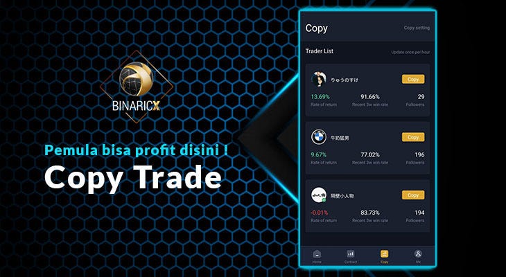 Tidak seperti platform lain, BinaricX memberikan kemudahan bagipara user nya seperti hal nya trader pemula, ada fitur copy trade dimana kita bisa mengikuti salah satu trader professionnal yang sudah di kualifikasi oleh pihak BinaricX.